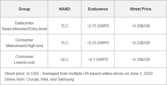 价格较低、体积较大的驱动器导致基于SLC和MLC的SSD数量减少。目前,TLC是主流,占有最大的市场份额。虽然QLC仍是一种相对较新的产品,但我们预期其低成本将吸引买家,特别是因为它经常被用来替代HDD。
