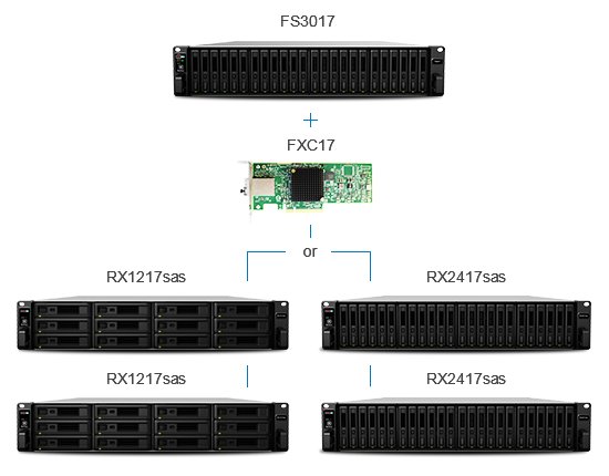 群晖FS3017 扩充卡 (FXC17) 专为 群晖FlashStation FS3017 而设计,可将其连接至 群晖扩充设备 RX1217sas 和 RX2417sas。当 FS3017 的存储容量达到上限时,在 FS3017 中安装此卡即可支持高达两台 RX1217sas 或 RX2417sas 设备,获得额外存储容量。FXC17 享有 群晖的 5 年有限保修服务。