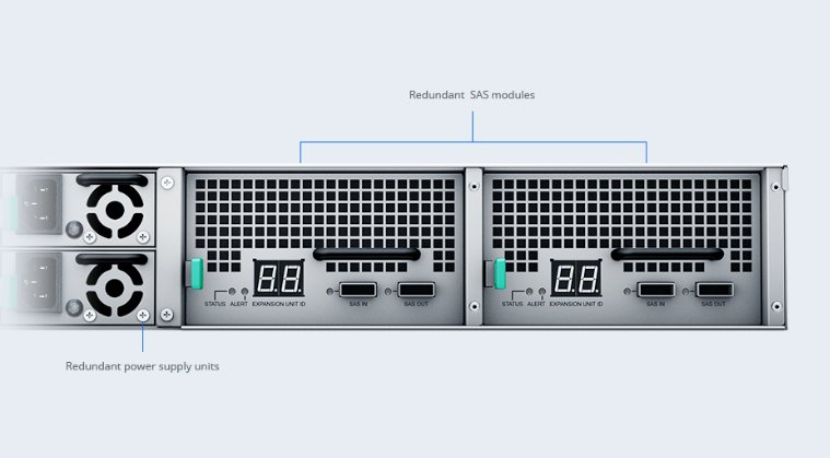 将多达 15 个 RXD1215sas 连接至双 RC18015xs+ 计算节点1,即可大规模扩容到多达 180 个硬盘,以及高达超过 1PB2 的原始存储容量。共享式存储结构省掉了通过网络复制数据之需,并大大降低了部署成本。
